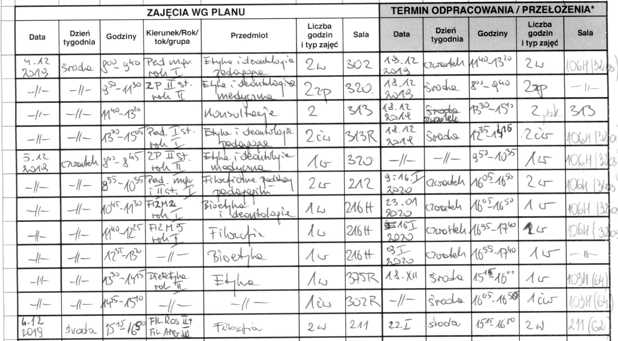 Zajęcia z ks. dr Jackiem Mucha z 04-05.12.2019 r. zostają przełożone na inne terminy. Poniżej znajduje się tabela przełożenia zajęć.