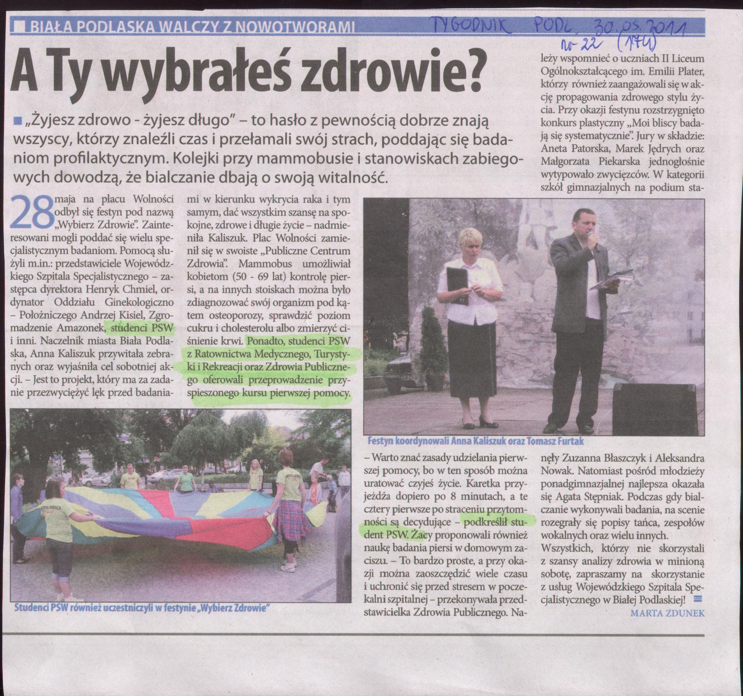 Już od 9:00 rano Plac Wolności tętnił życiem. Organizatorzy i wystawiający stoiska w błyskawicznym tempie rozstawiali namioty i sprzęt. Po otwarciu festynu i krótkim występie miejscowych zespołów wokalnych i tanecznych z-ca kierownika Zakładu Zdrowia Publicznego mgr Beata Kosińska zaprezentowała ofertę edukacyjną Państwowej Szkoły Wyższej zwracając szczególną uwagę na ofertę Instytutu Zdrowia. W dalszej części programu wystąpili studenci Instytutu: Mateusz Waśkiewicz - Udzielanie pierwszej pomocy, Katarzyna Kowalczyk - Samobadanie to zapobieganie, Paulina Król - Dieta przeciwnowotworowa.
